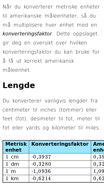 >Måleenheter>Omgjøring mellom metrisk og amerikanske enheter