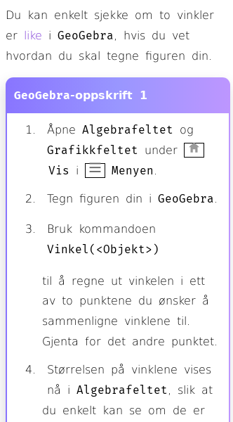 • Hvordan sjekke om to vinkler er like i GeoGebra